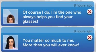Generally, most of my interactions follow a similar format, with each giving a buff and a mini-conversation popping up in the notifications, which allows you to see how the other Sim responded: