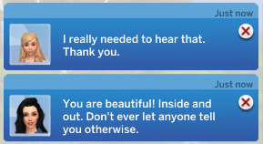 - All interactions in this mod will give a conversation between Sims in the notifications, so you can see how the Sim responded to it! Each interaction has multiple possible responses, so that performing the interaction more than once (or with different Sims) may lead to different results